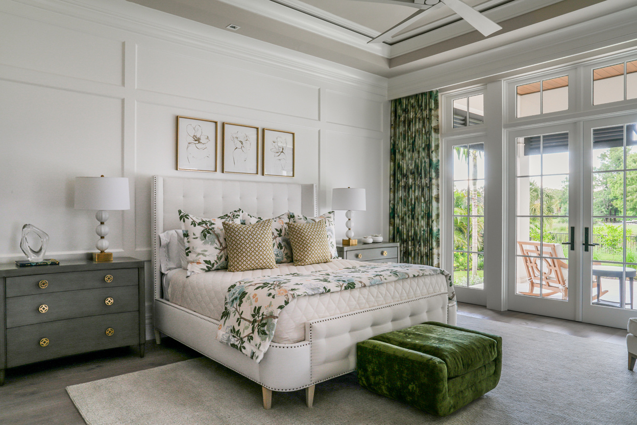 This Quail West home seamlessly combines formal architecture with pared-down luxury, creating an inviting and livable environment. A clean, transitional design features soft curves, floral motifs, and a warm palette of taupe, gold, and black accents.Thoughtful details like custom cabinetry, sculptural lighting, and curated finishes elevate the interiors while maintaining a sense of comfort. Spaces are designed for relaxed entertaining, from the family room’s custom bar to the spacious dining area and loft.The master suite and main living areas showcase a harmonious blend of elegance and personal touches, reflecting the homeowners’ unique style and effortless sophistication.