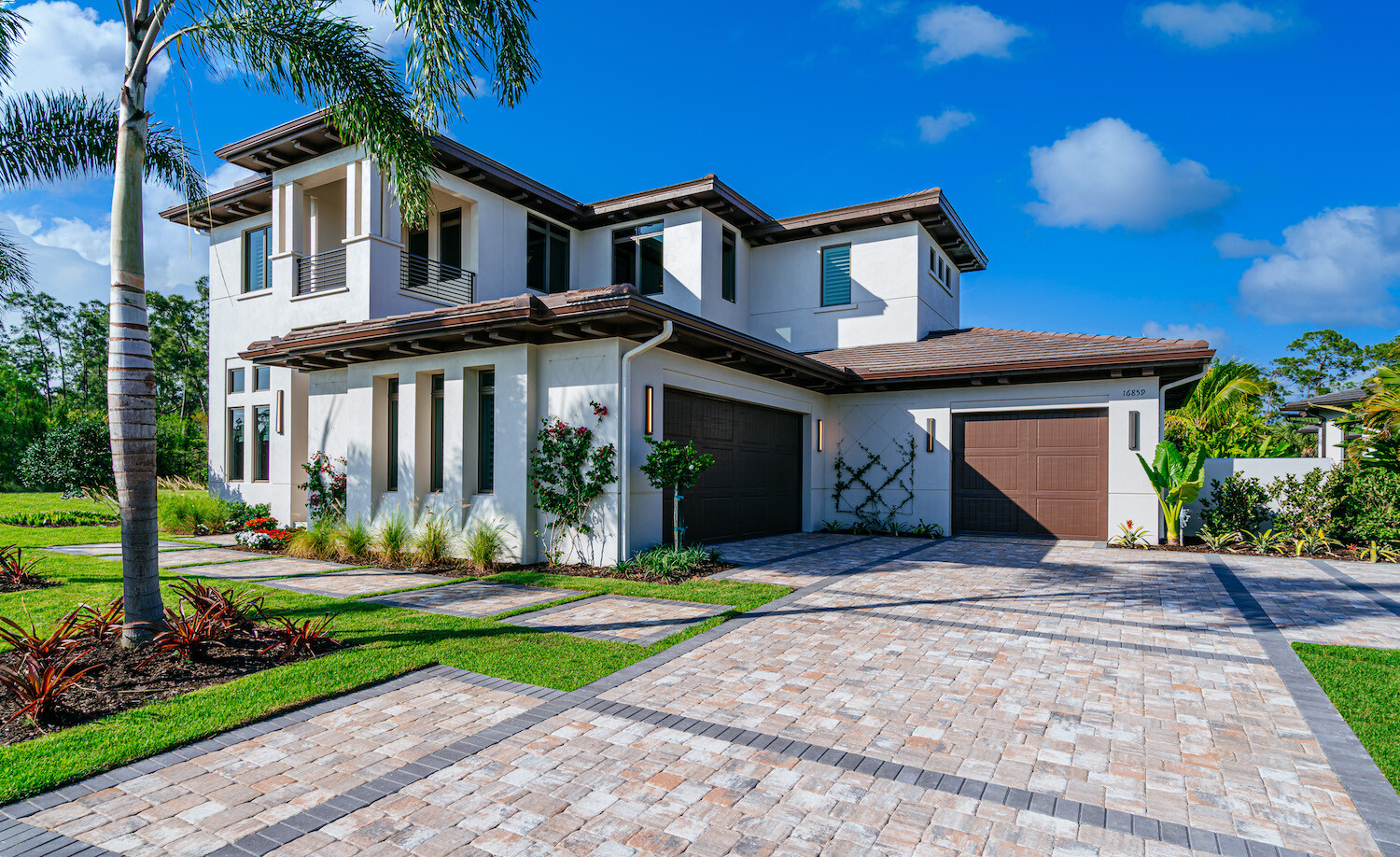 This luxurious home combines modern elegance with timeless design elements, creating an inviting and sophisticated atmosphere throughout. The owner’s bedroom features a serene palette of soft neutrals, with a canopy bed as the focal point, complemented by warm wood tones and plush textiles. The expansive great room seamlessly connects to the outdoor living area, perfect for entertaining, with comfortable seating, a stone fireplace, and a view of the pool. The guest bathroom offers a bold contrast with deep blue textured walls, a sleek vanity, and geometric tile flooring, adding a touch of contemporary flair to the home’s overall aesthetic.